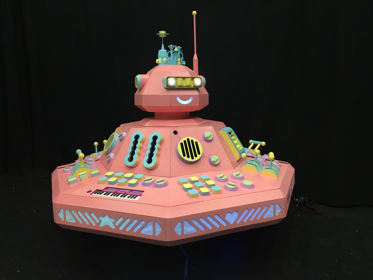 The machine featured a moving head, lights, and ticklers, as well as a playable keyboard. Its design was inspired by the robots of the 80s and aspects of the Memphis movement.